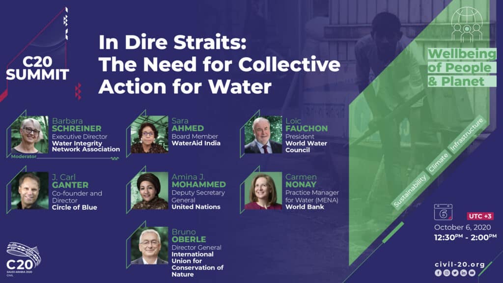 6 octobre 2020 - A l'occasion du Sommet du C20, le Conseil mondial de l'eau a participé à la table ronde virtuelle « In Dire Straits : the Need for Collective Action for Water Security » organisée par le Civil Society Engagement Group C20, un groupe d'engagement officiel du G20.